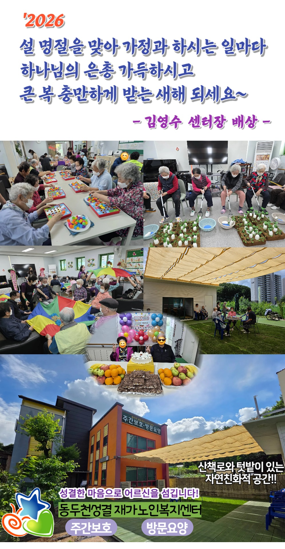 안녕하세요. 2026년 설 명절 연휴 기간(2/16~2/18)중 우리 성결재가노인복지센터는 명절 당일인 2/17(화)하루만 휴원합니다. 이용에 착오 없으시기 바랍니다. 새해 복 많이 받으시고, 늘 가정에 평안과 행복이 넘치시길 바랍니다. 부모님은 저희가 성실과 사랑으로 섬기겠습니다. 감사합니다. ![]() |